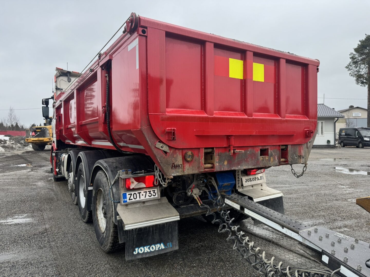 Pv. Vahvarunkoinen Jyki vm.23. levyjarrut, rautajouset 3. ja 5. akselin nosto bpw akselit paripyörillä Nokian renkailla 315/80. 5 aks. ilmajousi ykköspyörä akseli 385/65. Jokopan päällirakenne. lava 8/5, 450 Hardox, 300 pyöristys. hydrauli peitteet, parkkivalot/räpsyt. Lava6.5m