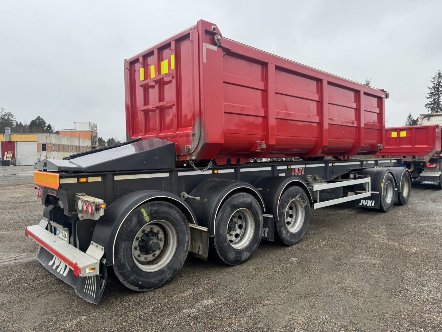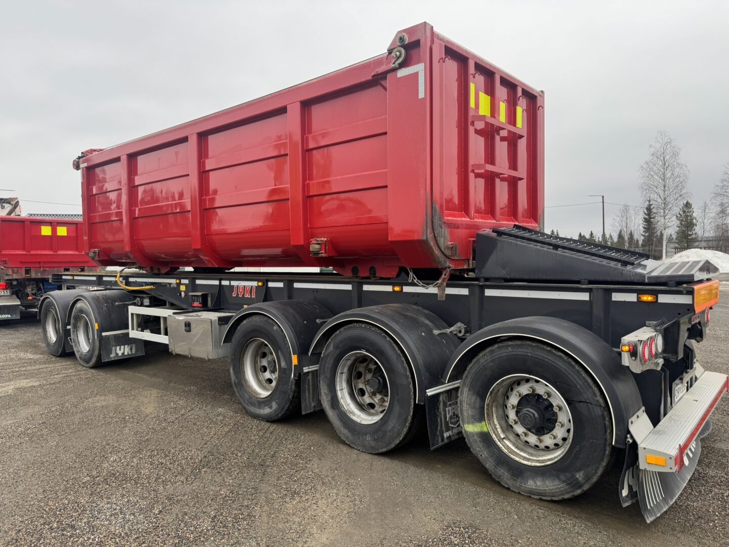 Pv. Vahvarunkoinen Jyki vm.23. levyjarrut, rautajouset 3. ja 5. akselin nosto bpw akselit paripyörillä Nokian renkailla 315/80. 5 aks. ykköspyörä akseli 385/65. Jokopan päällirakenne. lava 8/5, 450 Hardox, 300 pyöristys. hydrauli peitteet, parkkivalot/räpsyt Lava 6,